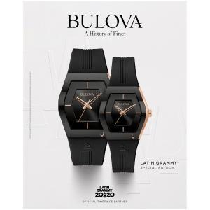 As the official Timepiece partner of The Latin GRAMMYs�, Bulova has created the Latin GRAMMY� Gemini, a new curved tonneau design. The distinctive asymmetrical rose gold-tone stainless steel case with a black signature Futuro edge to edge curved metalized crystal features a black dial with rose gold-tone accents. The black silicone strap features the iconic Latin GRAMMY� logo on the front, as well as on the case back which showcases the platinum colored logo to commemorate the 21st Annual Latin GRAMMY� Awards. The watch features a three-hand quartz movement, deployant buckle with pushers, and water resistance to 30 meters.
