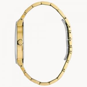 In black IP and gold-tone stainless steel with three diamonds on black dial, three-hand date feature, metalized edge-to-edge curved crystal, screw-back case, gold-tone stainless...