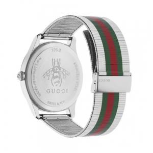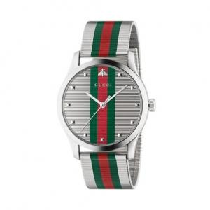 Steel case, mesh pattern dial, steel mesh bracelet with printed green-red-green web
