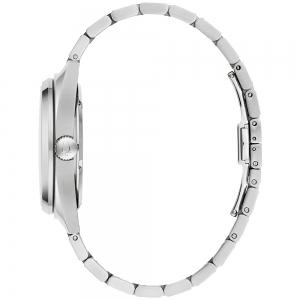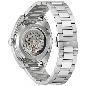 This new men�s automatic timepiece from the Bulova Surveyor collection offers modern design and luxurious craftmanship at an exceptional price. The contemporary stainless-steel case delivers an eye-catching brushed and polished surfaces with a subtle angularity and a domed mineral crystal. The remarkable dial is dominated by the display of the skeletonized automatic 21-jewel movement, which features a 42-hour power reserve. Surrounding the dial is a blue chapter ring with applied hour indices, which is complemented by angular hands with luminescent fill. The watch is paired with a matching stainless-steel bracelet for a seamless look on the wrist. With a captivating dial and appealing design, this watch is the perfect timepiece for everyday style.